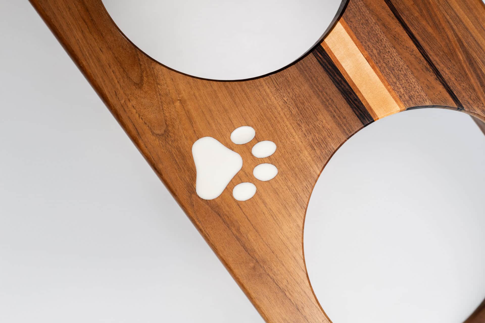 The top features precision-cut bowl openings and subtle maple and wenge inlay details, offering a refined contrast that highlights the natural beauty of the wood grain. Each feeder is carefully shaped, sanded, and finished by hand to ensure smooth edges, durability, and long-lasting performance.