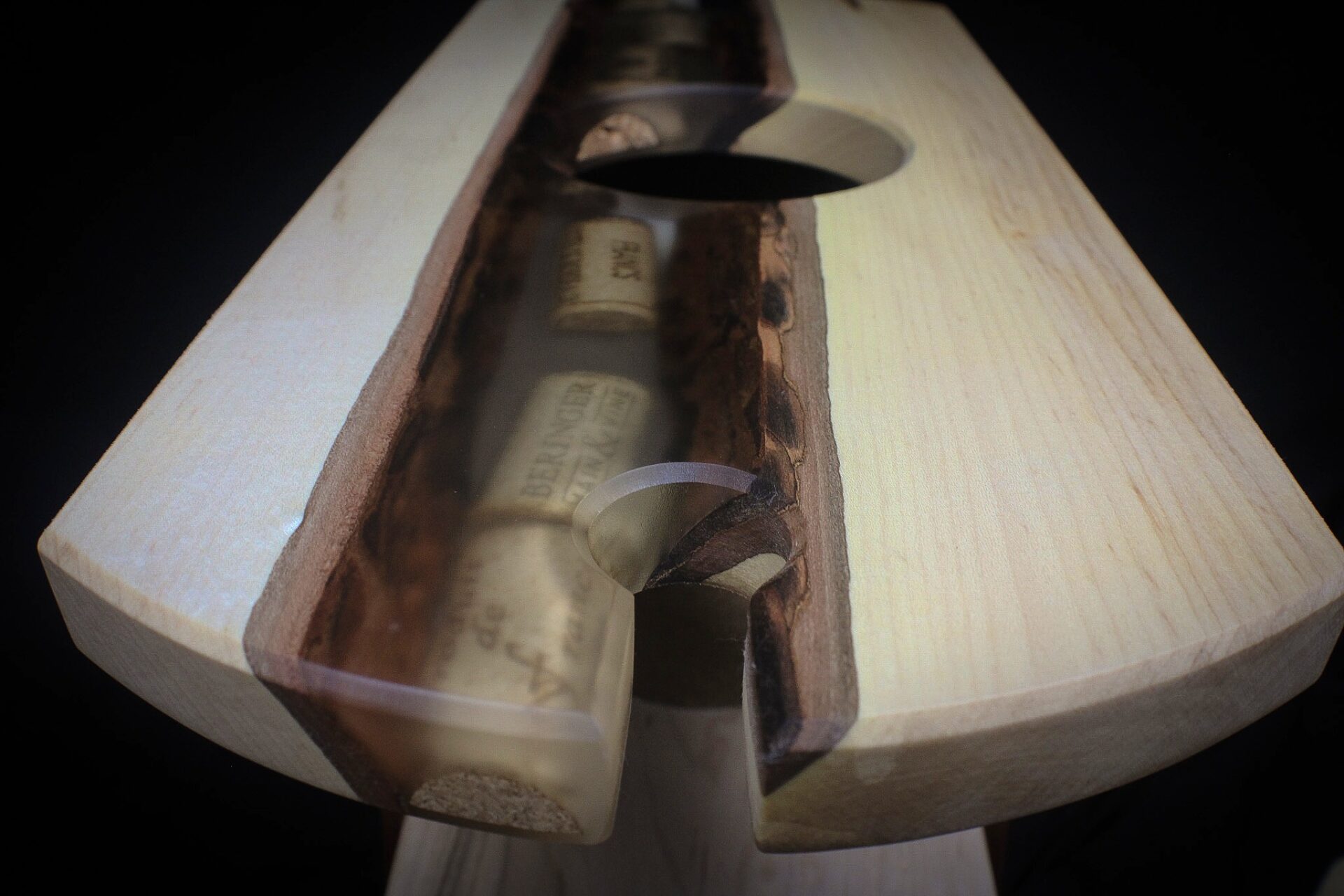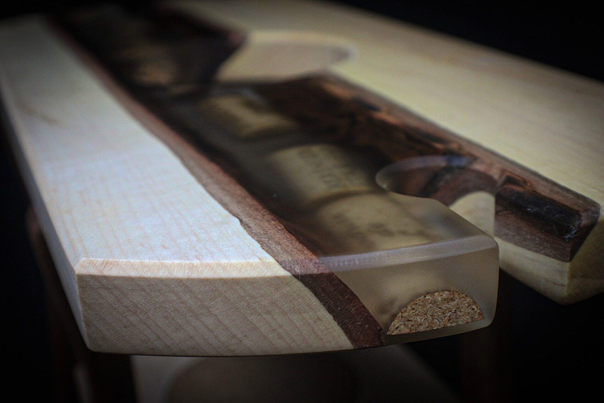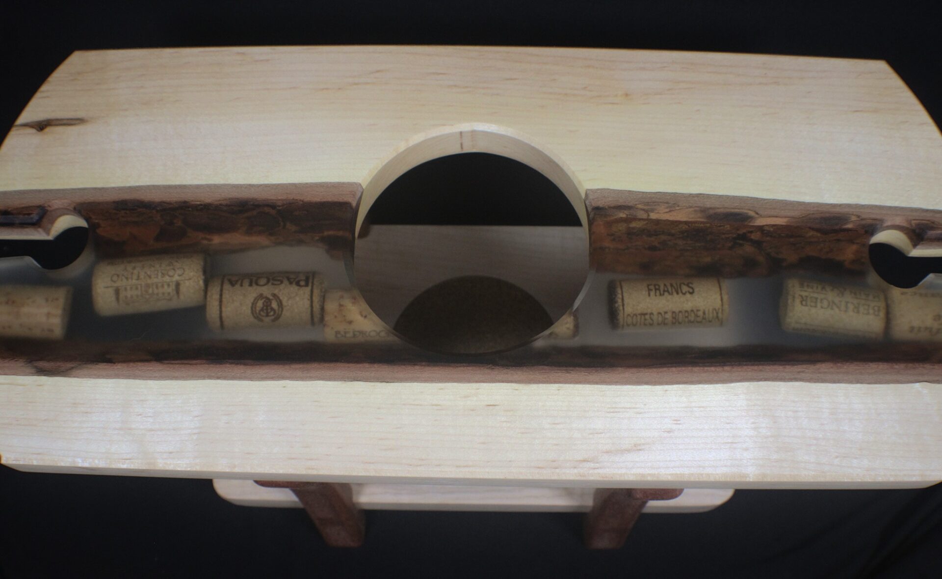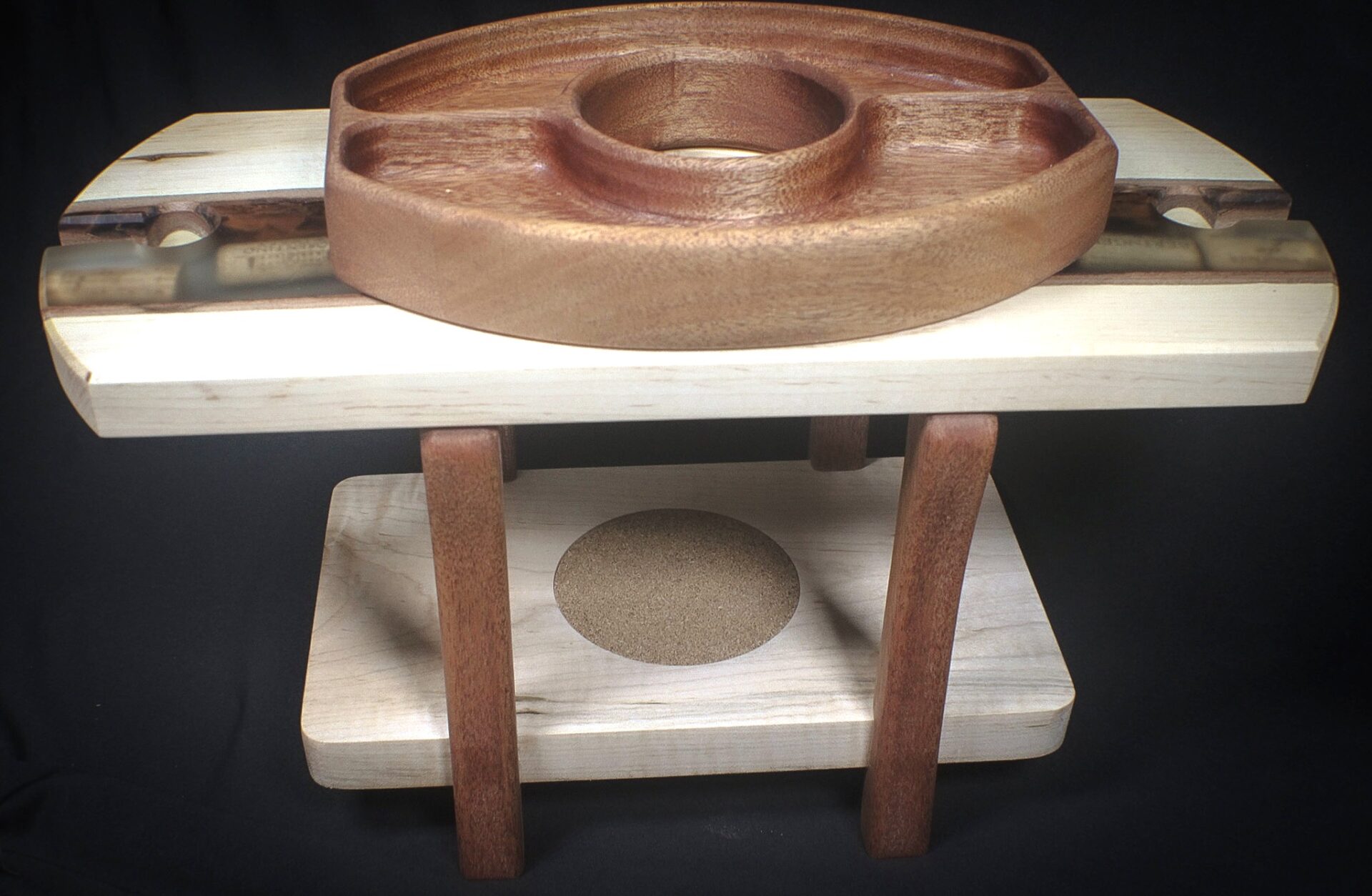 This handcrafted serving stand combines maple and mahogany in a modern, elevated design made for hosting. The top features a beautifully carved round tray with individual compartments—ideal for snacks, charcuterie, or wine accessories. Beneath it, a durable maple base includes an inset cork pad, adding grip and protection for bottles or glasses. Four sculpted mahogany legs provide a clean mid-century touch and a sturdy raised profile.