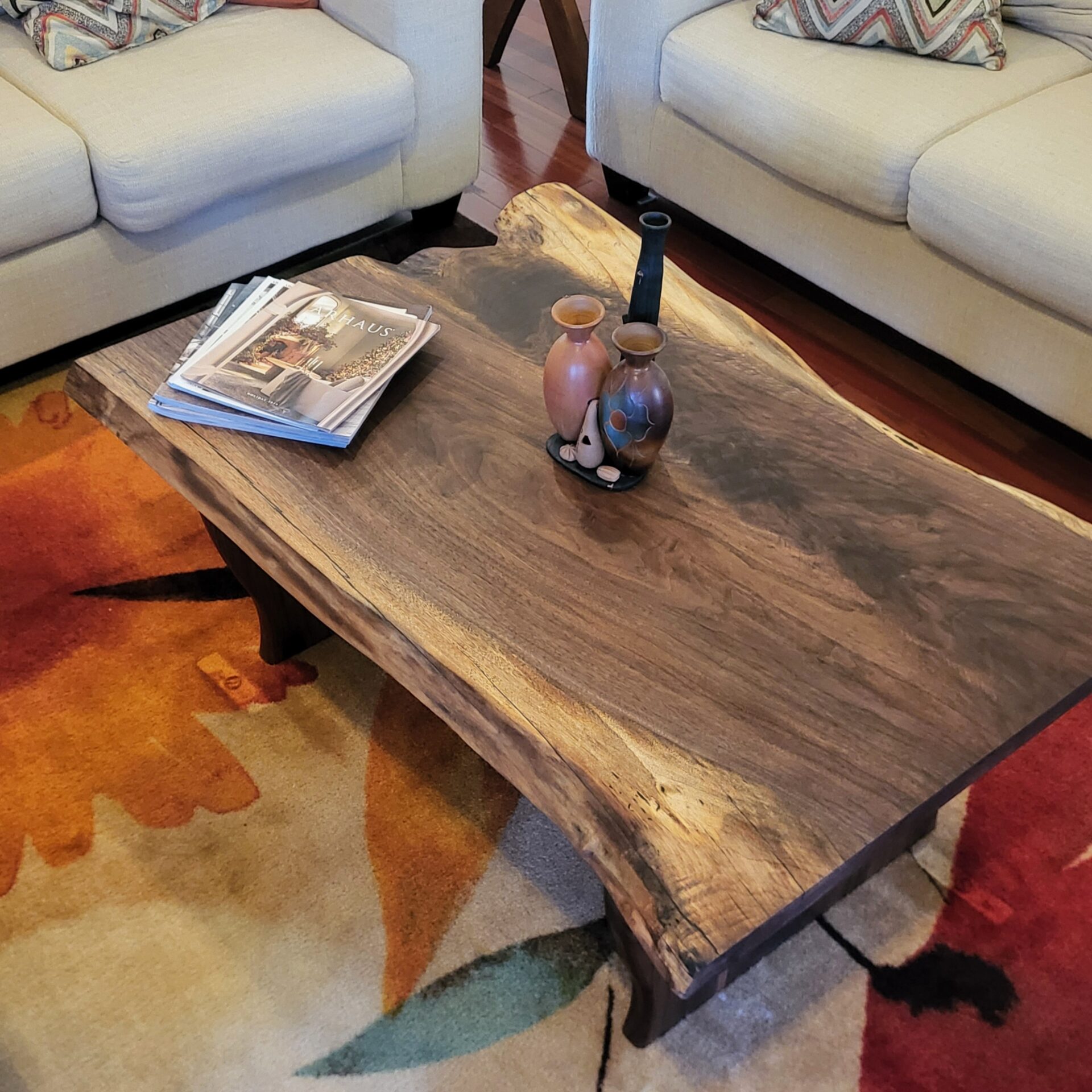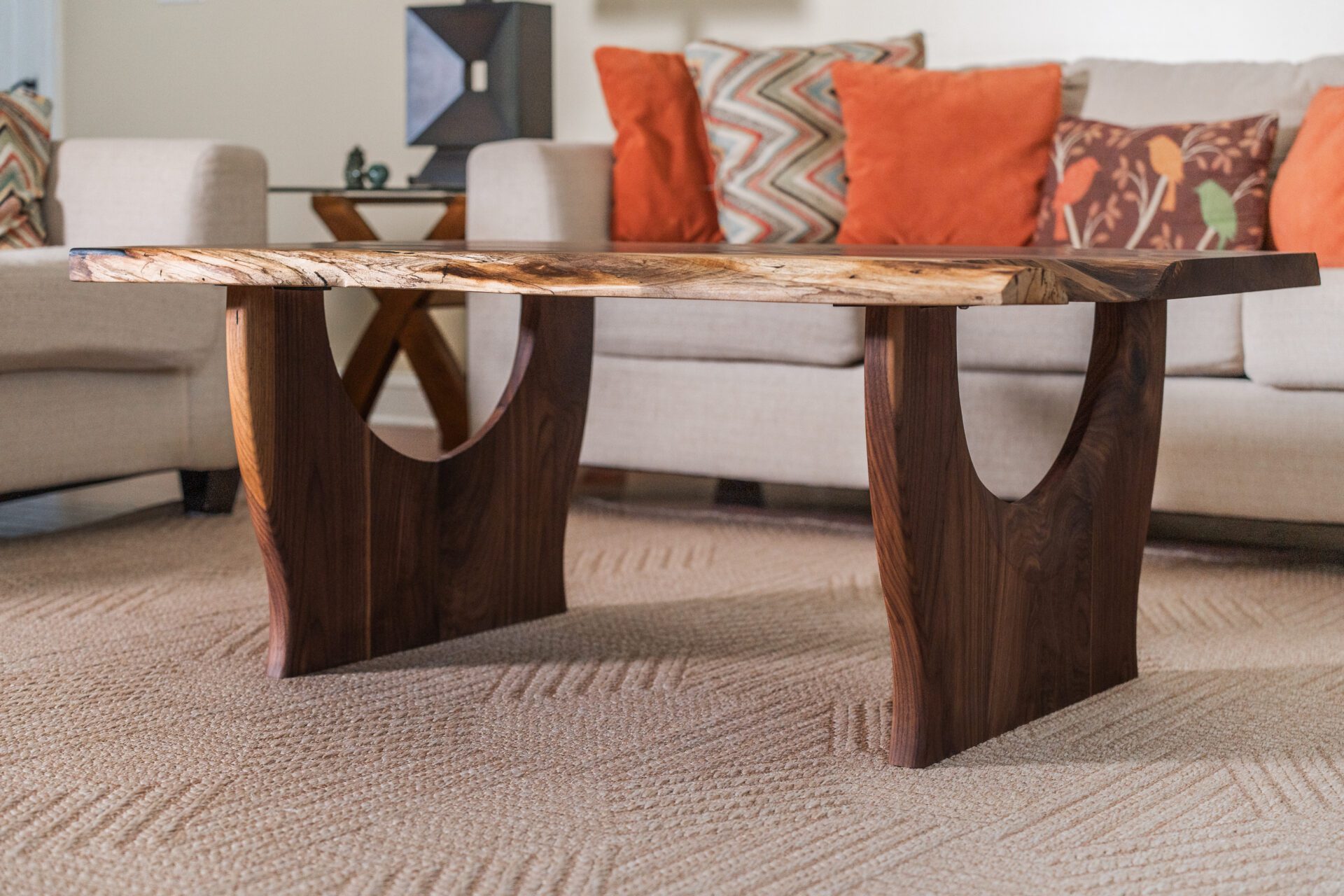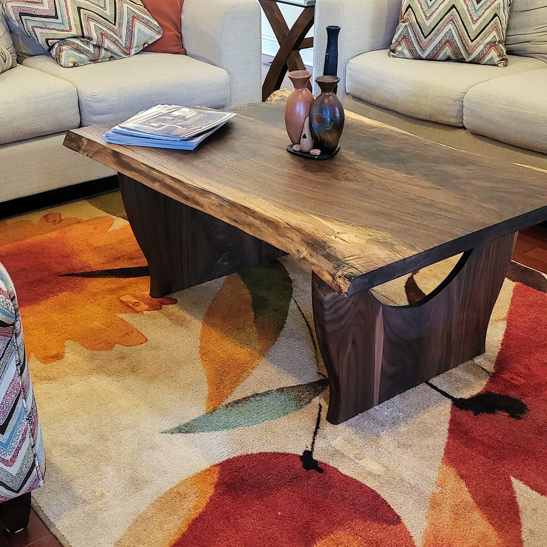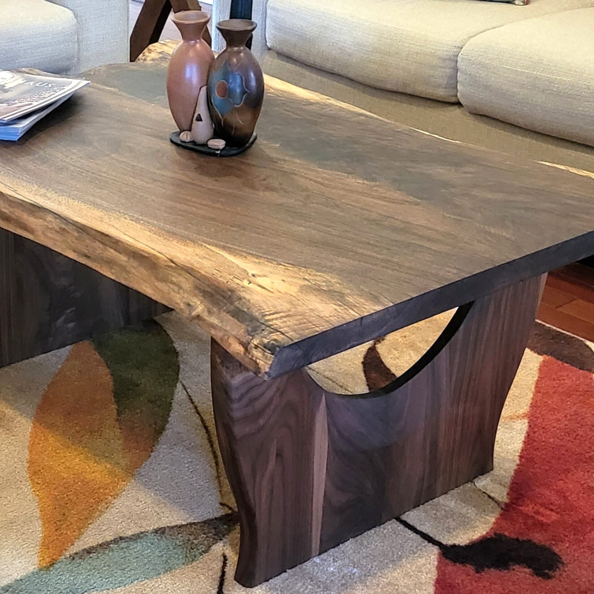 This elegant coffee table is crafted entirely from solid walnut, showcasing the wood’s rich tones and flowing grain. The live-edge top preserves the natural beauty of the slab, while the unique curved-leg base adds a bold, modern architectural touch. Handmade with precision and designed to stand out, this piece brings warmth, character, and refined craftsmanship to any living room.