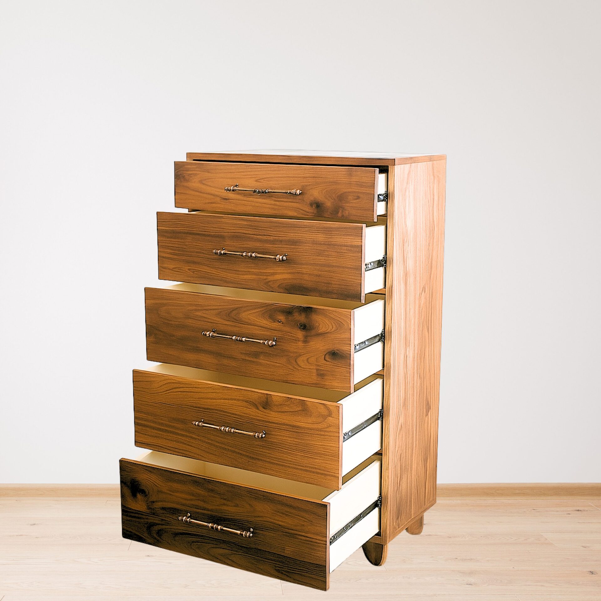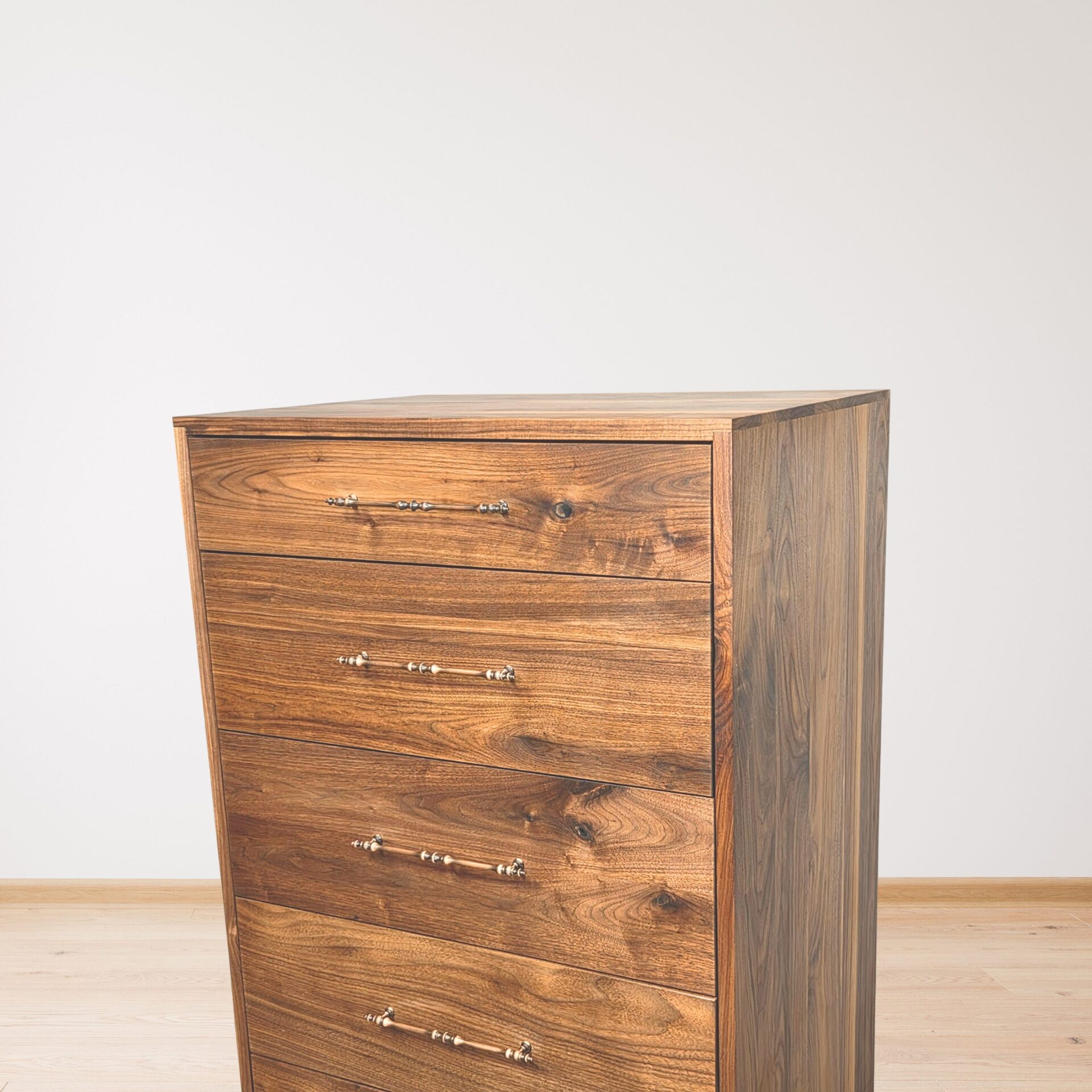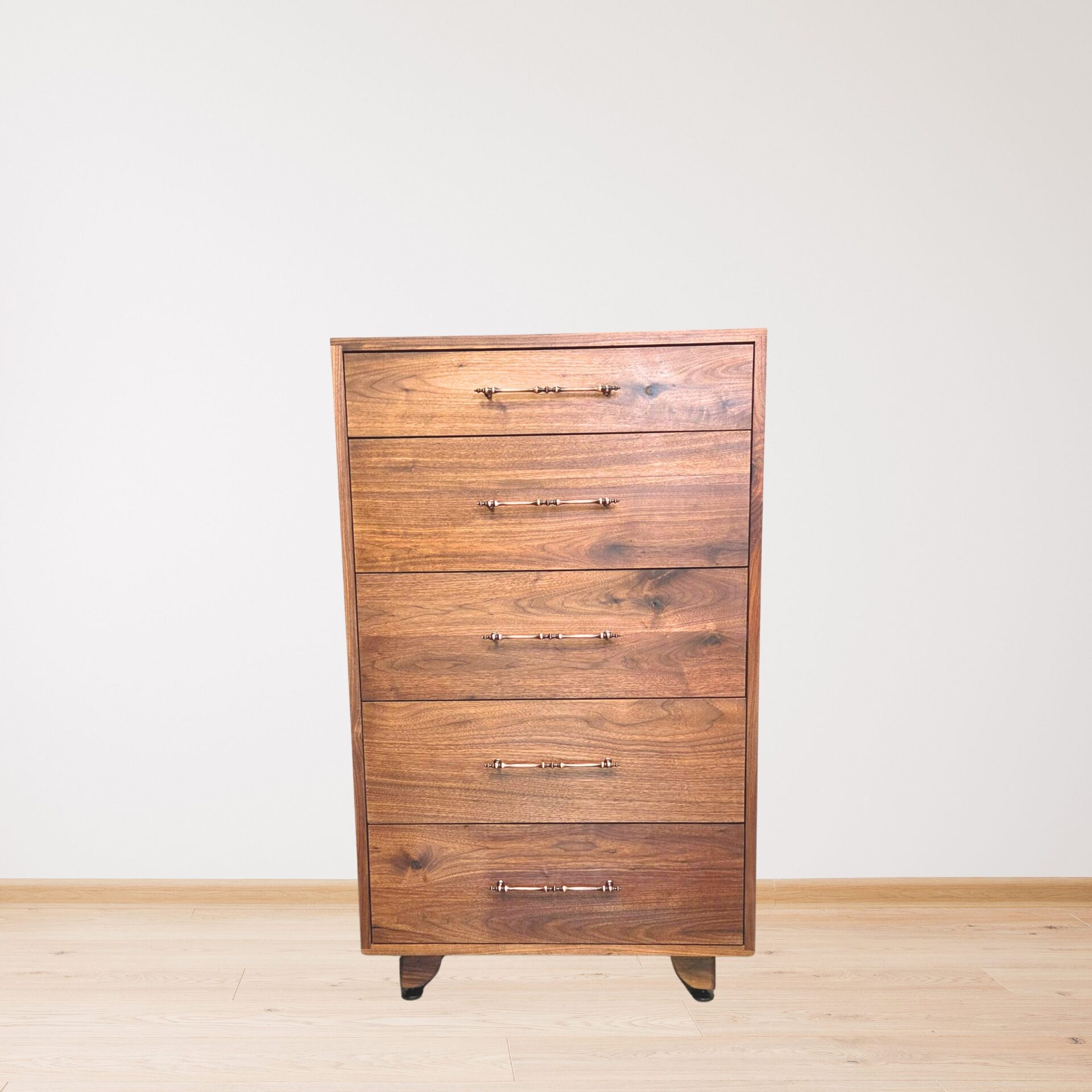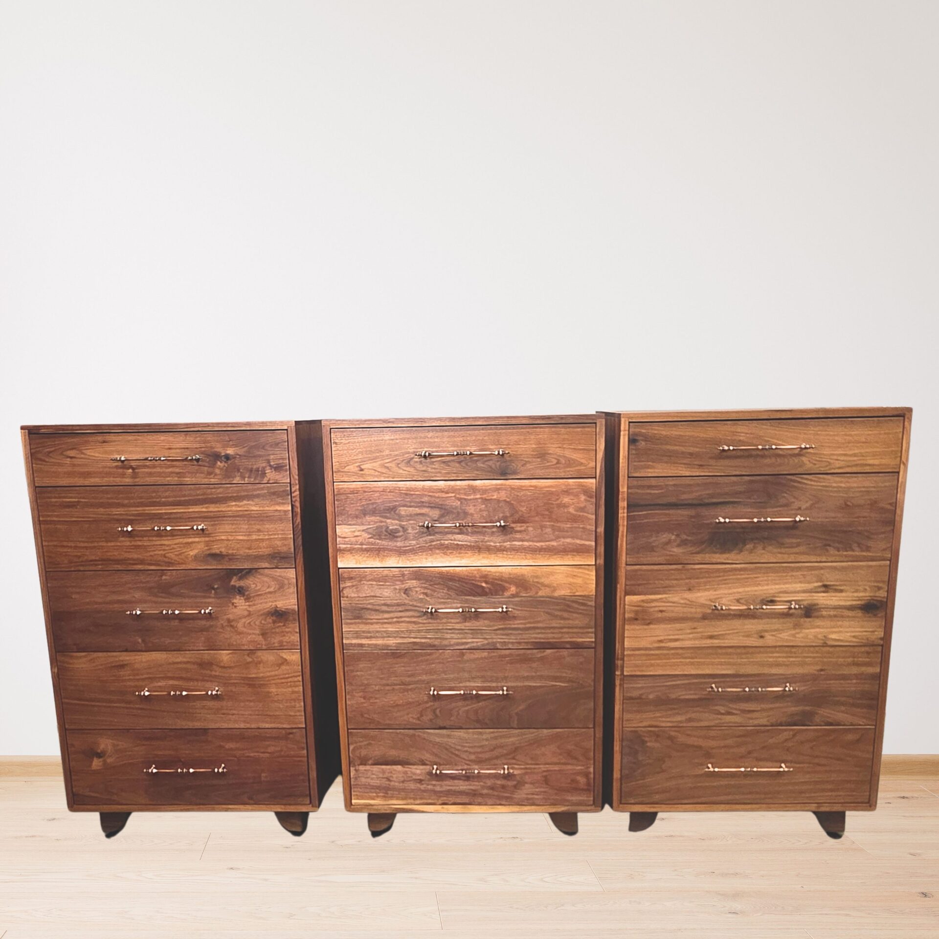 These modern dressers are crafted entirely from solid walnut, each showcasing the unique grain, warmth, and natural variation of the wood. Designed with clean lines and a timeless silhouette, they feature smooth-gliding drawers accented by refined brass hardware. The sturdy construction and minimalist style make them versatile for any bedroom—whether modern, contemporary, or rustic. Built with precision and longevity in mind, these walnut dressers bring both beauty and functional storage to your home.