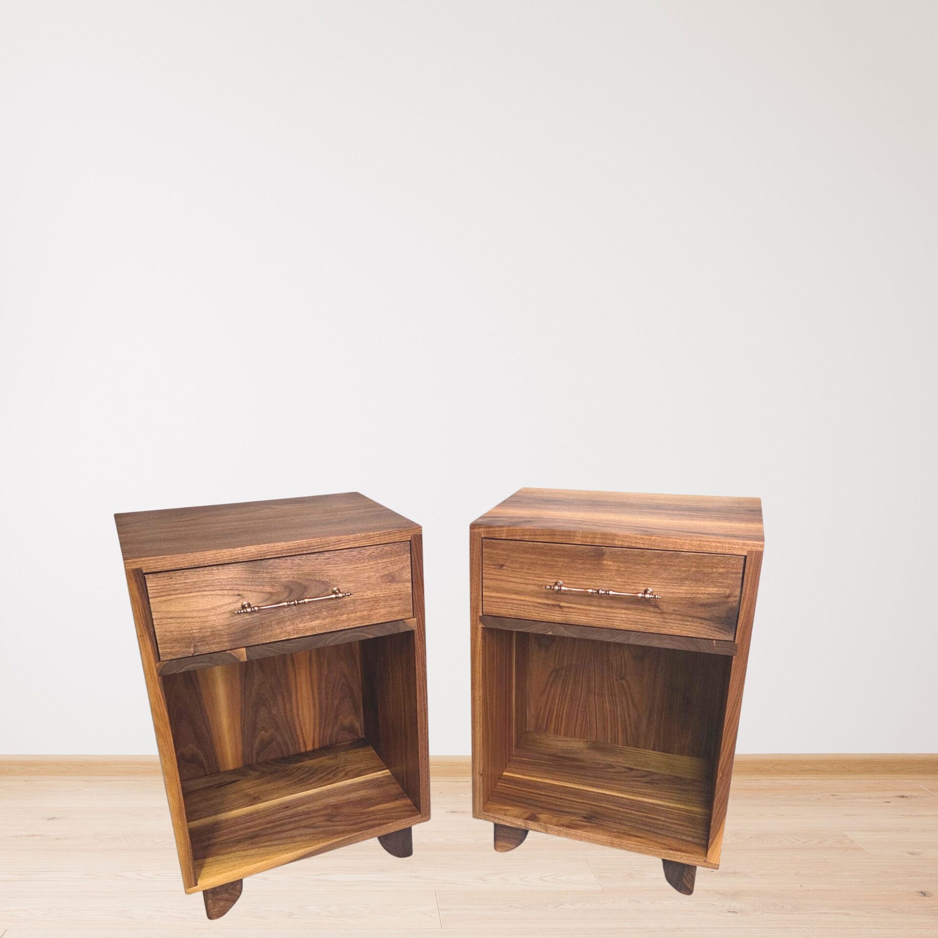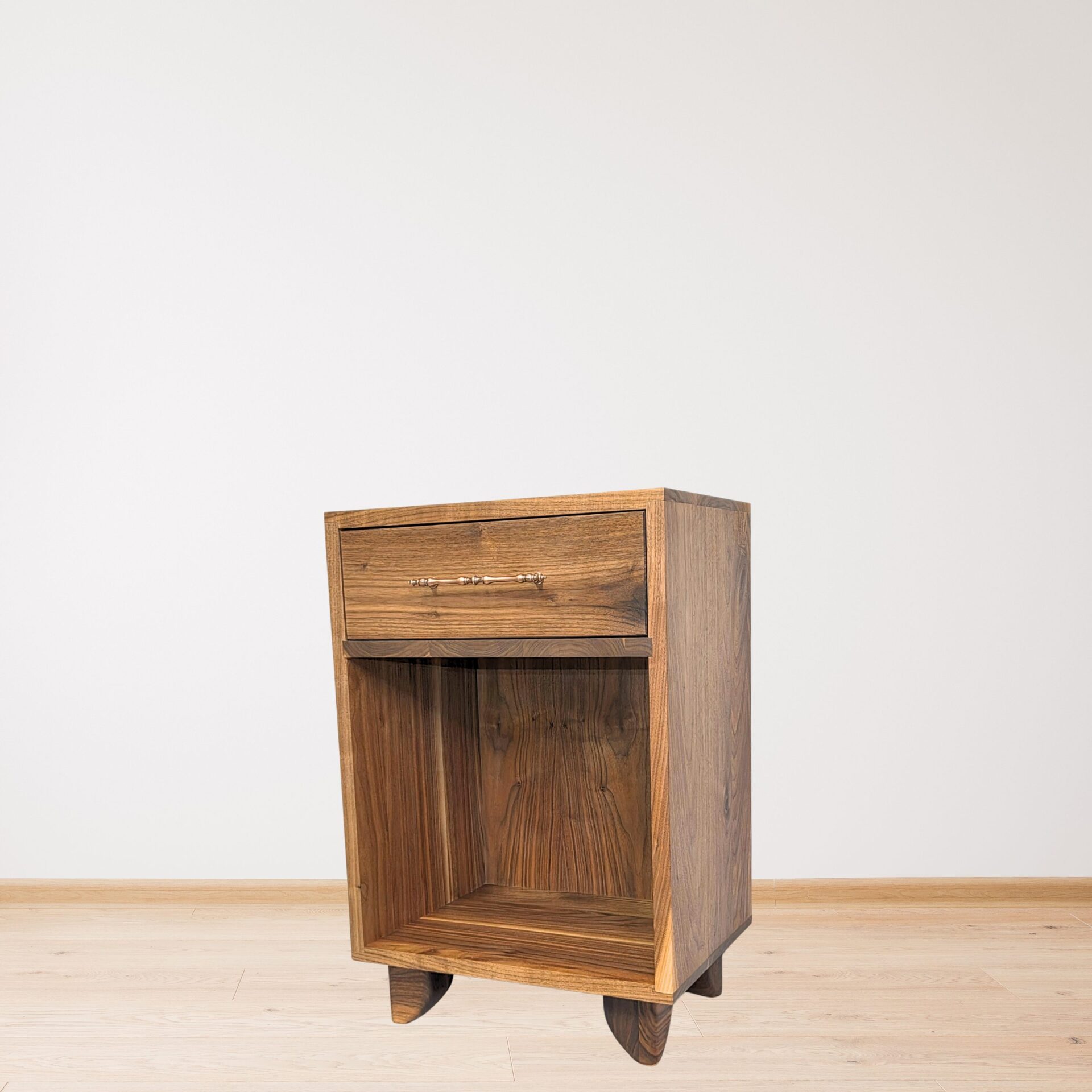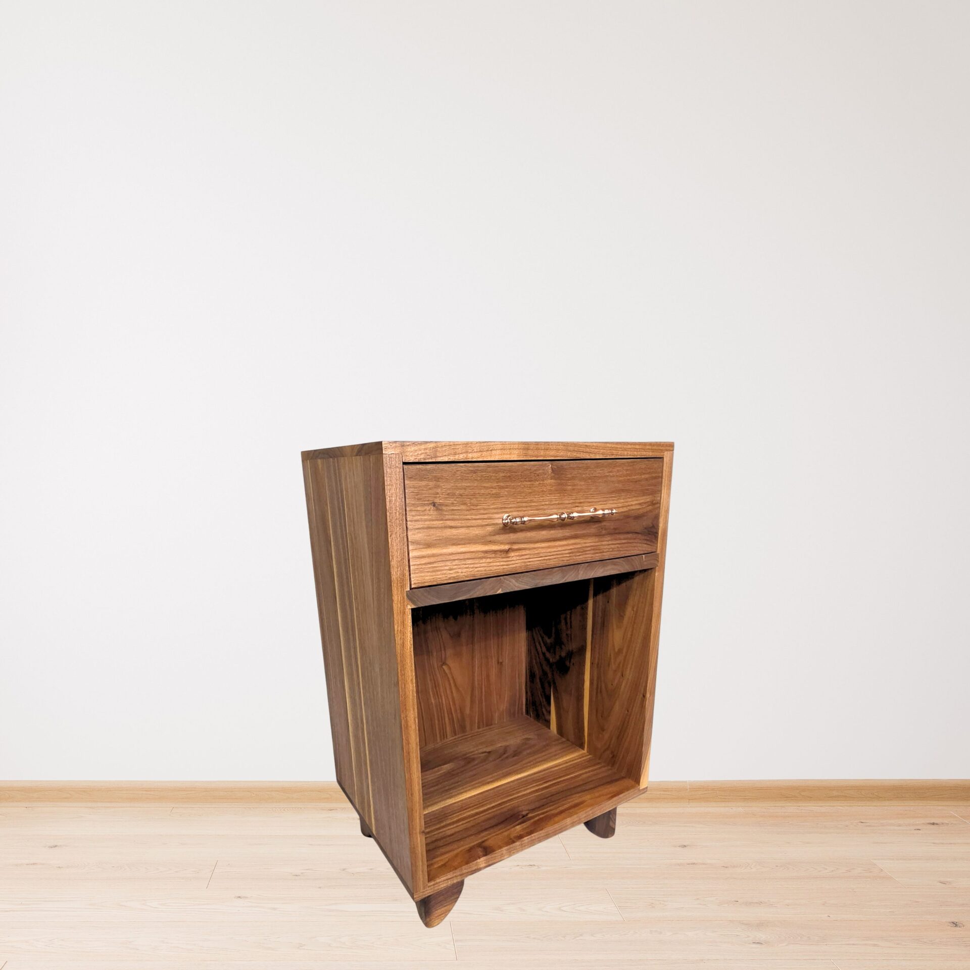 This modern nightstand is crafted entirely from solid walnut, showcasing the wood’s beautiful grain and rich natural tones. It features a smooth-opening drawer accented with an elegant brass pull, paired with a spacious open shelf for easy-access storage. Clean lines, refined craftsmanship, and minimalist details make this piece a perfect fit for any bedroom style—from modern to rustic to mid-century. Built to last and designed to stand out, it brings warmth, function, and beauty to your space.