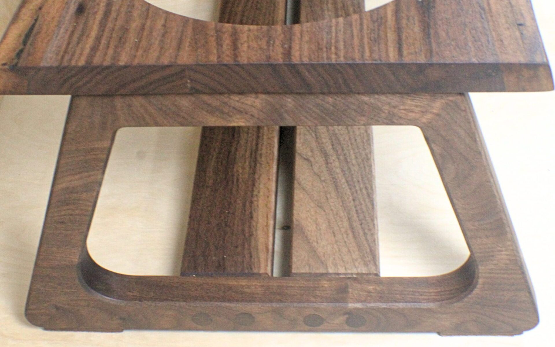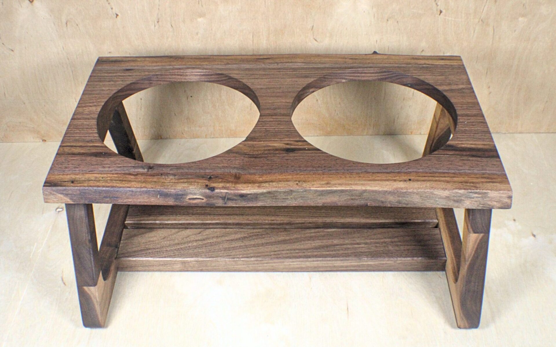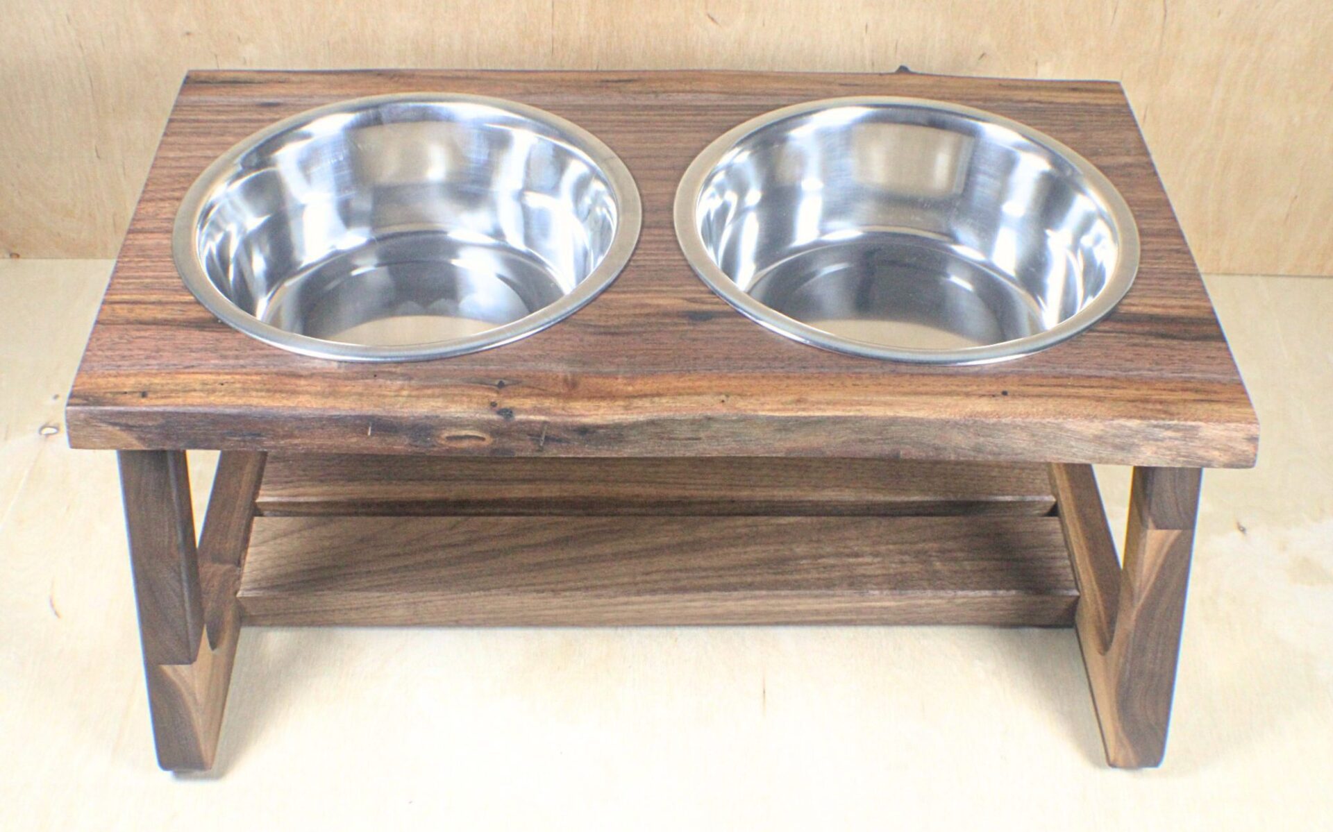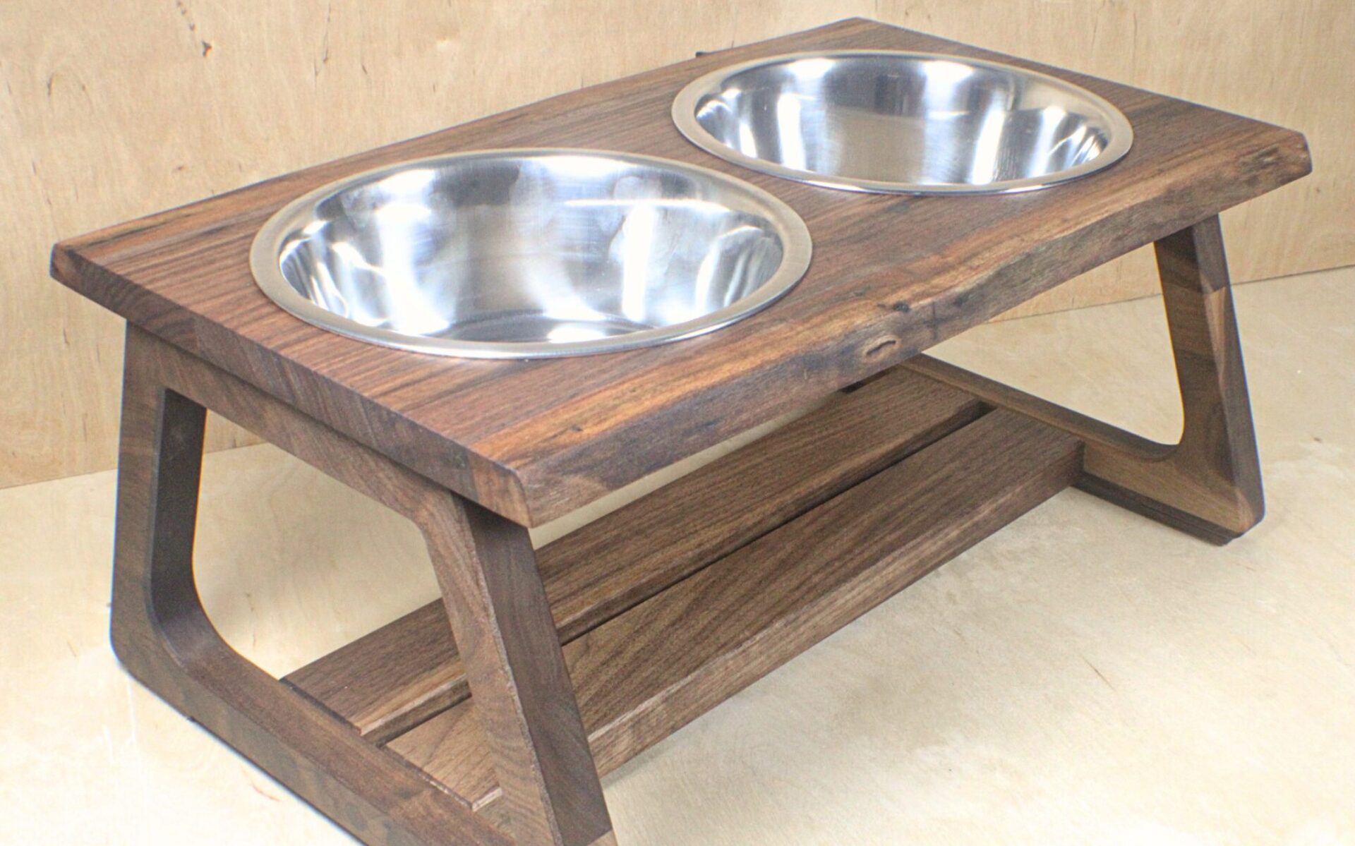 This elevated feeder is crafted from premium walnut wood, highlighting the beauty of natural grain and live-edge detailing. The modern open-frame design provides stability and a sculptural look, while the lower shelf adds balance and subtle storage. It includes two stainless steel bowls that are durable, easy to clean, and perfectly complement the warm tones of the walnut. Designed to blend seamlessly with contemporary interiors, this feeder brings elegance and craftsmanship to your pet’s daily routine.