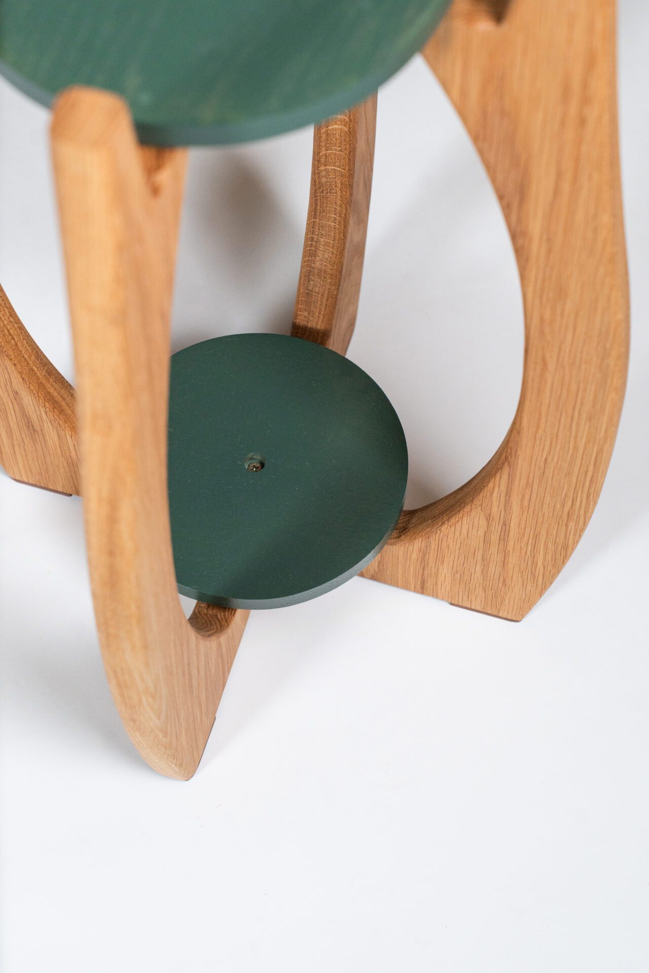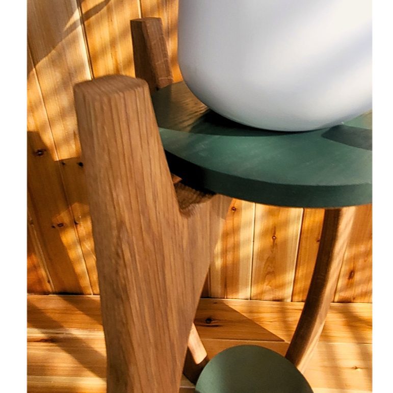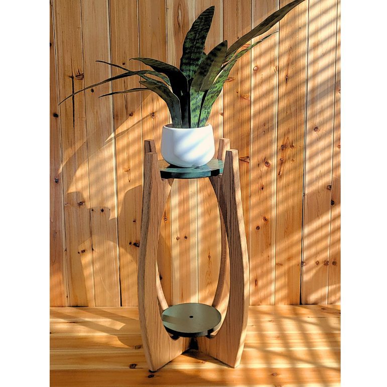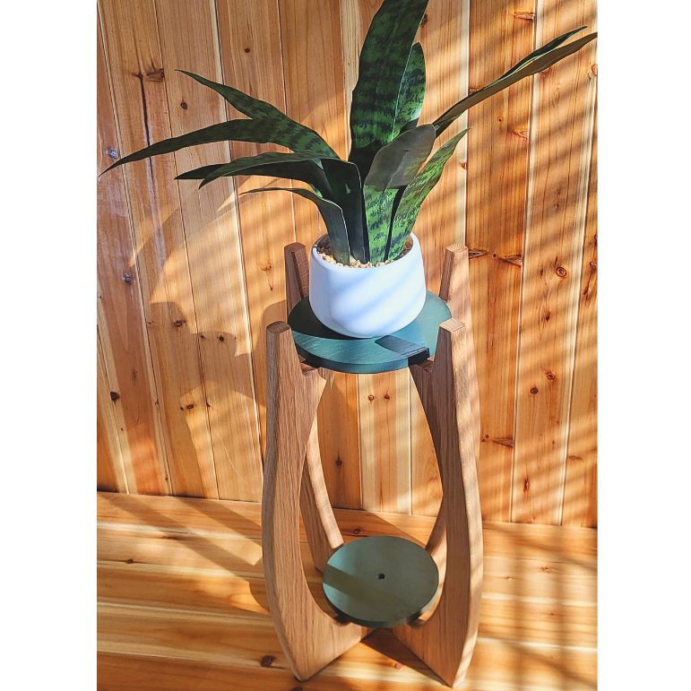 Handcrafted from solid white oak, this modern planter stand features elegant curved legs and two powder-coated steel platforms for added stability and style. Its mid-century–inspired form highlights the natural grain of the wood while providing a sturdy base for plants or decorative accents. A perfect statement piece for any living room, entryway, or office.