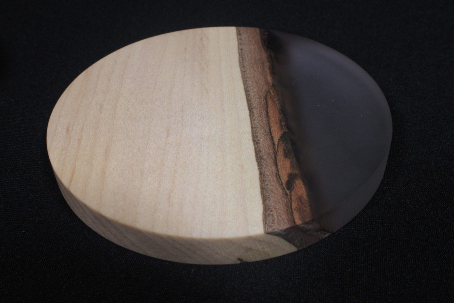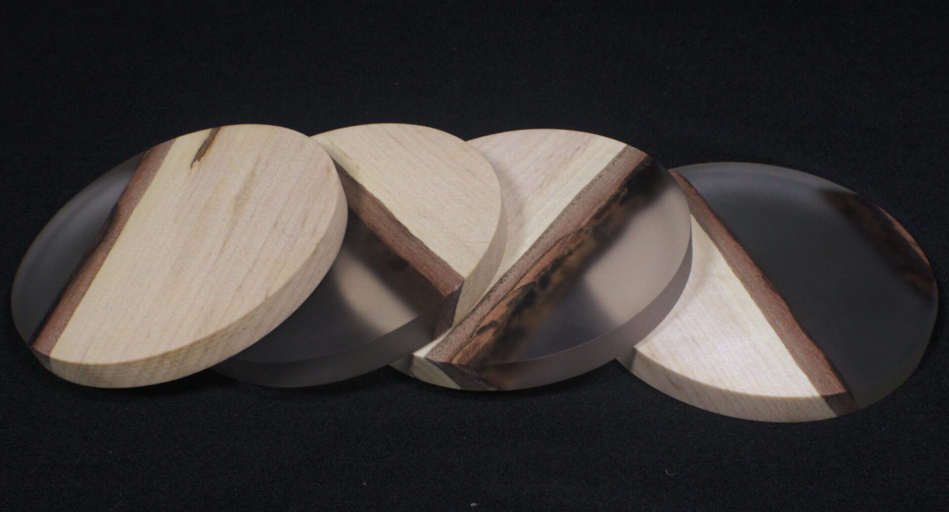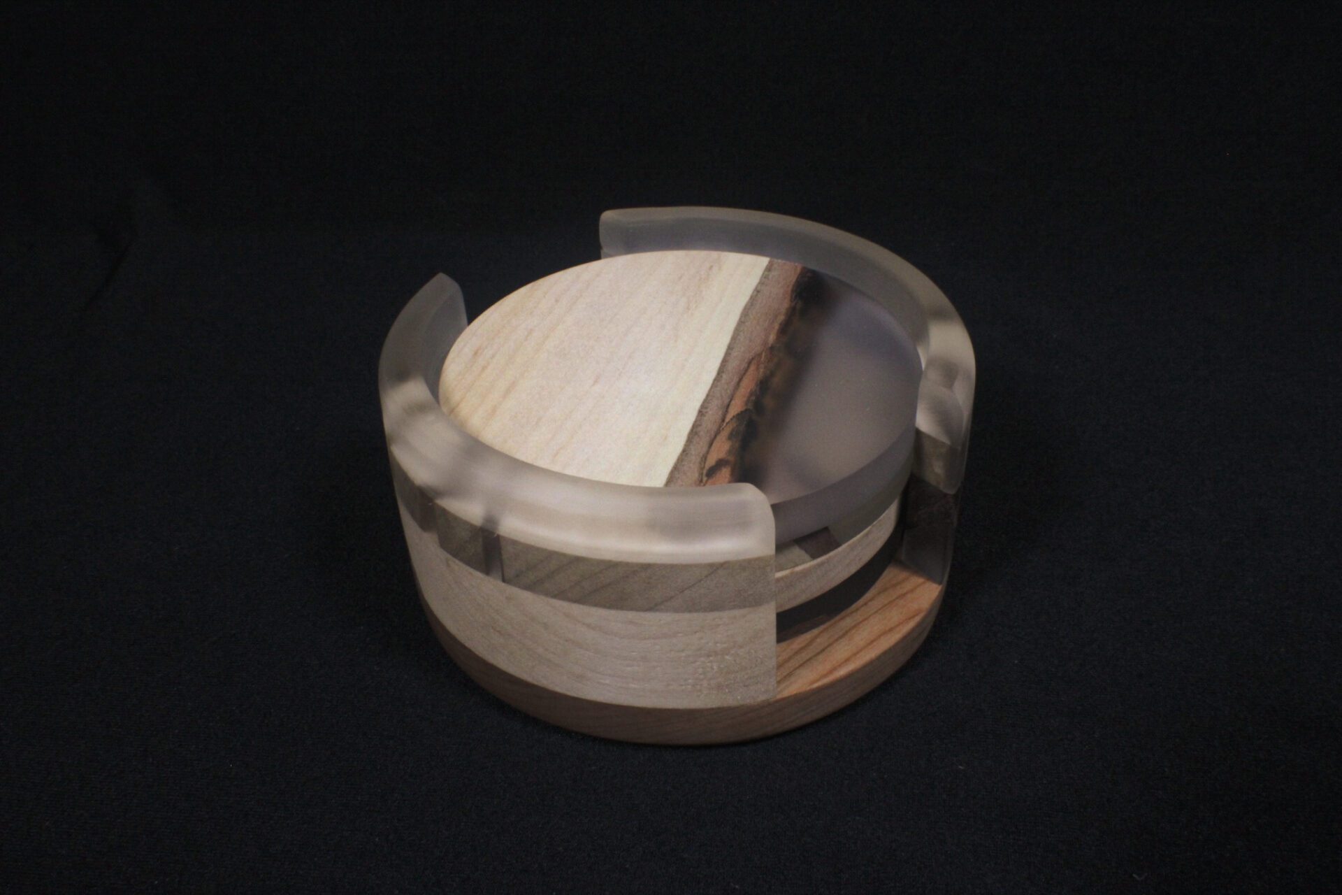 Crafted from solid wood and translucent resin, this round coaster set brings together nature’s texture and contemporary design. Each coaster highlights the natural grain and live edge of the wood encased in smooth resin, creating a striking visual contrast. The coordinating holder keeps the set neatly organized and ready for use. Perfect for elevating any coffee table or bar setup with a touch of refined craftsmanship.
