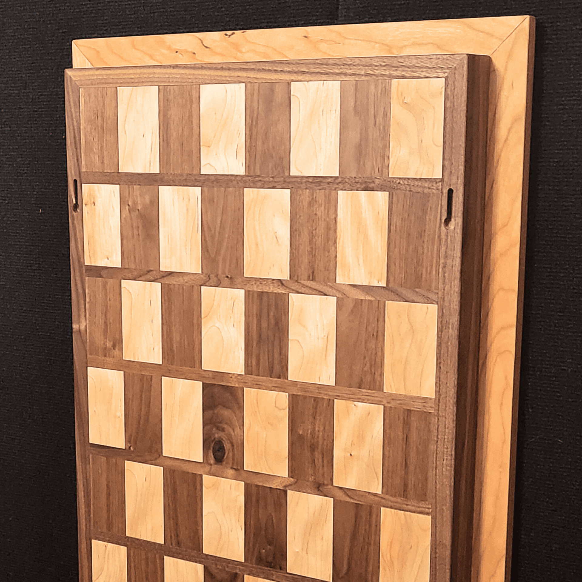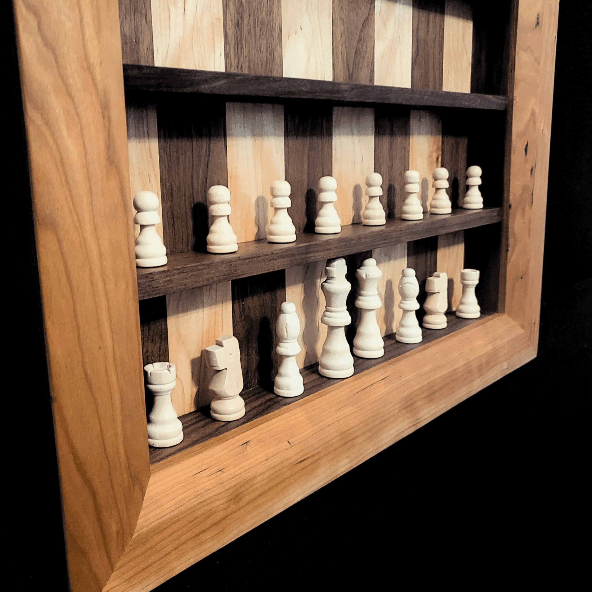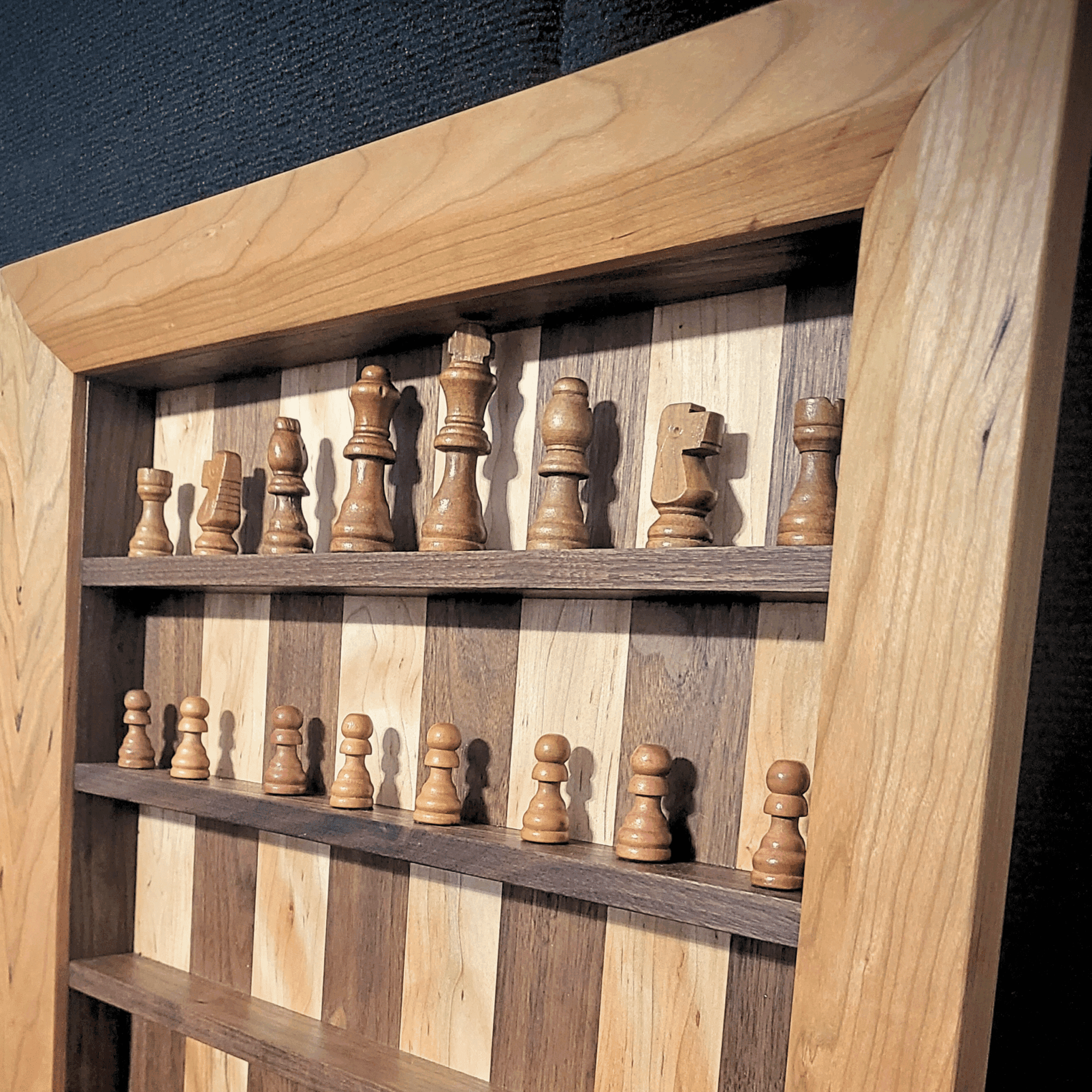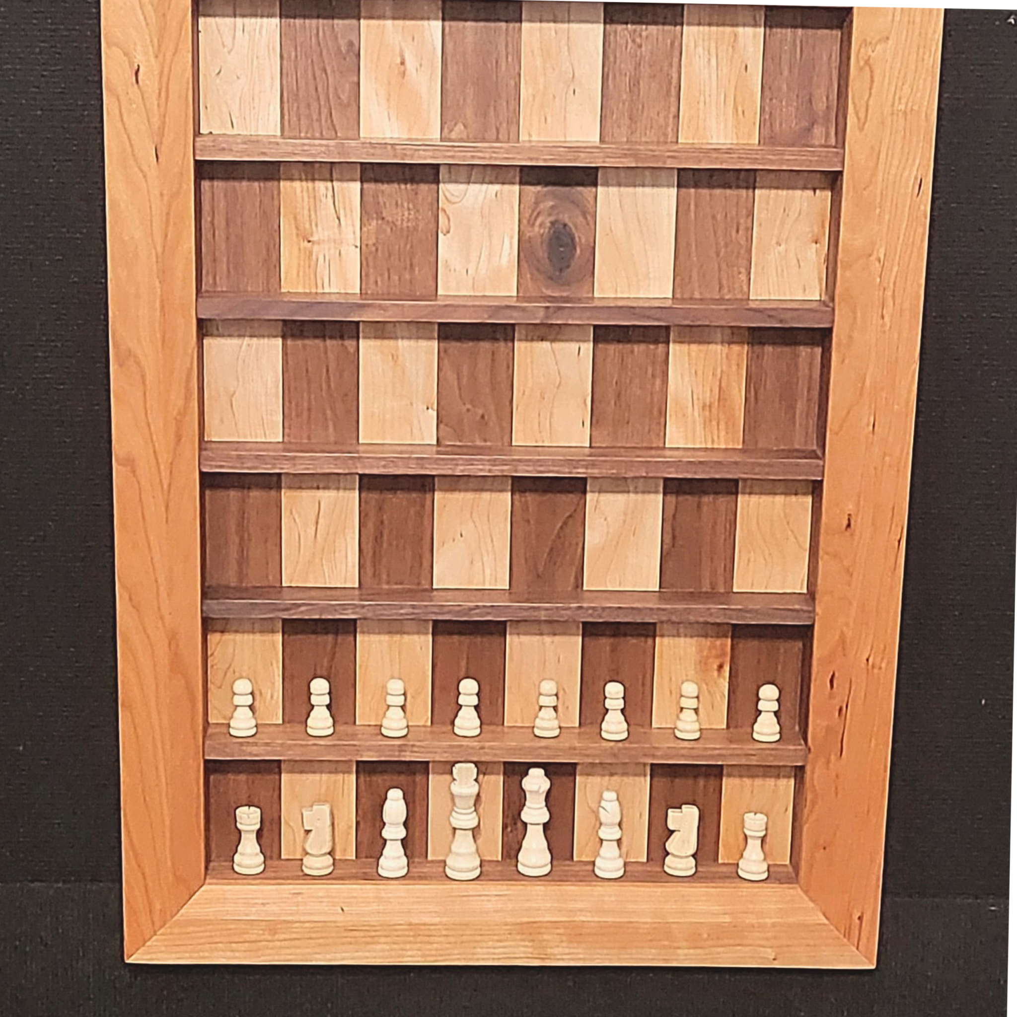 This unique vertical chessboard is designed to hang on the wall, turning a classic game into a functional piece of art. Handcrafted from solid walnut and maple wood, it features alternating wood tones that create a beautiful checker pattern. Built with precision shelves to securely hold each piece, it allows you to play or display your game in style. Includes a complete set of chess pieces. Custom wood options and finishes available upon request.