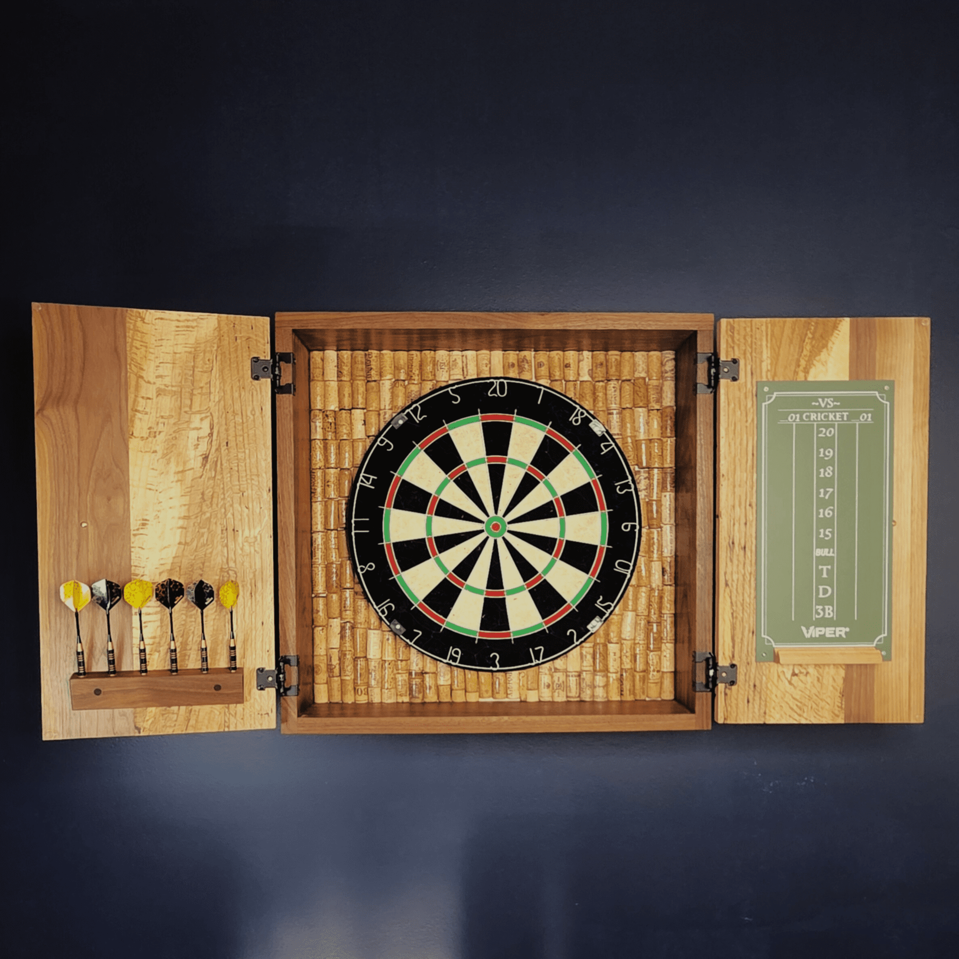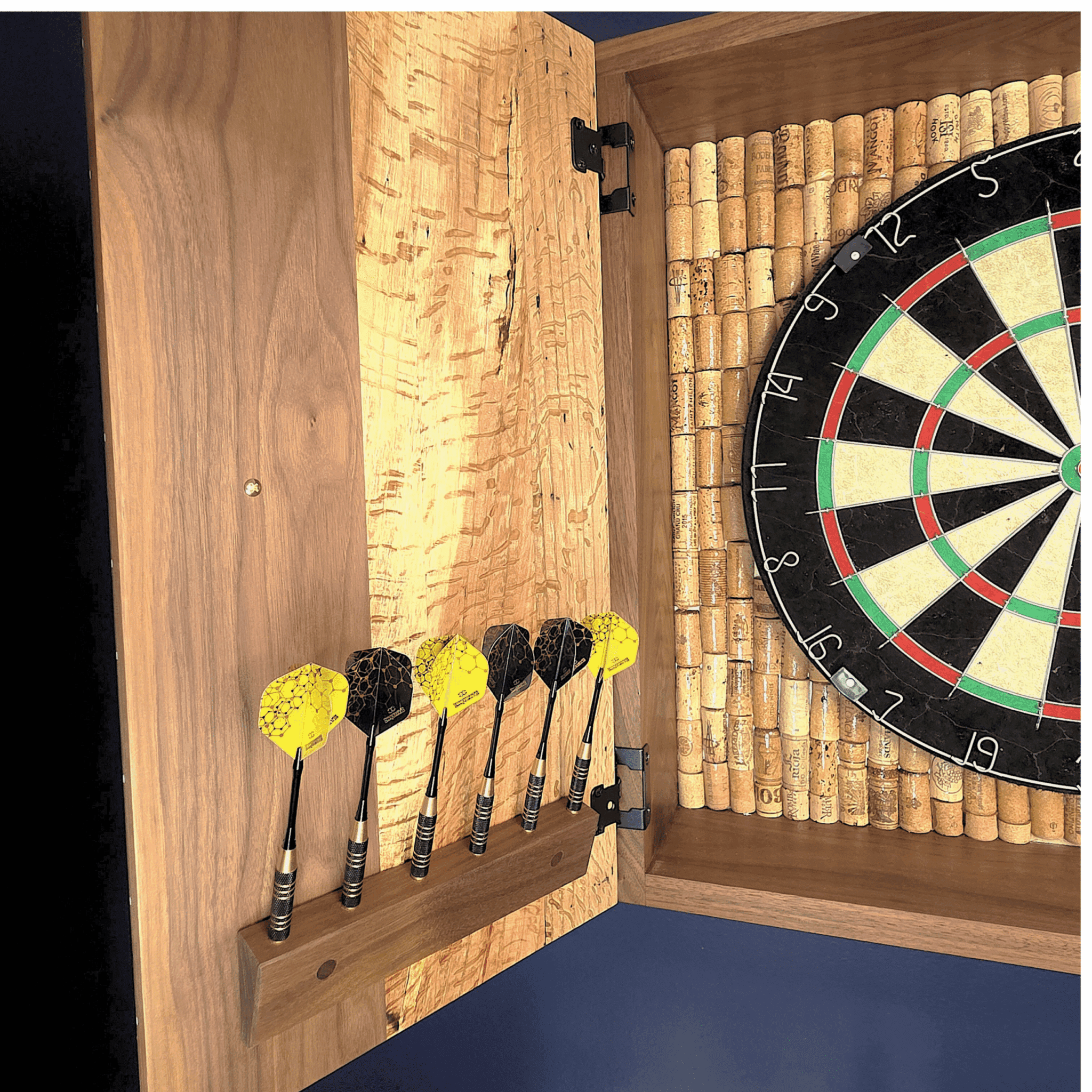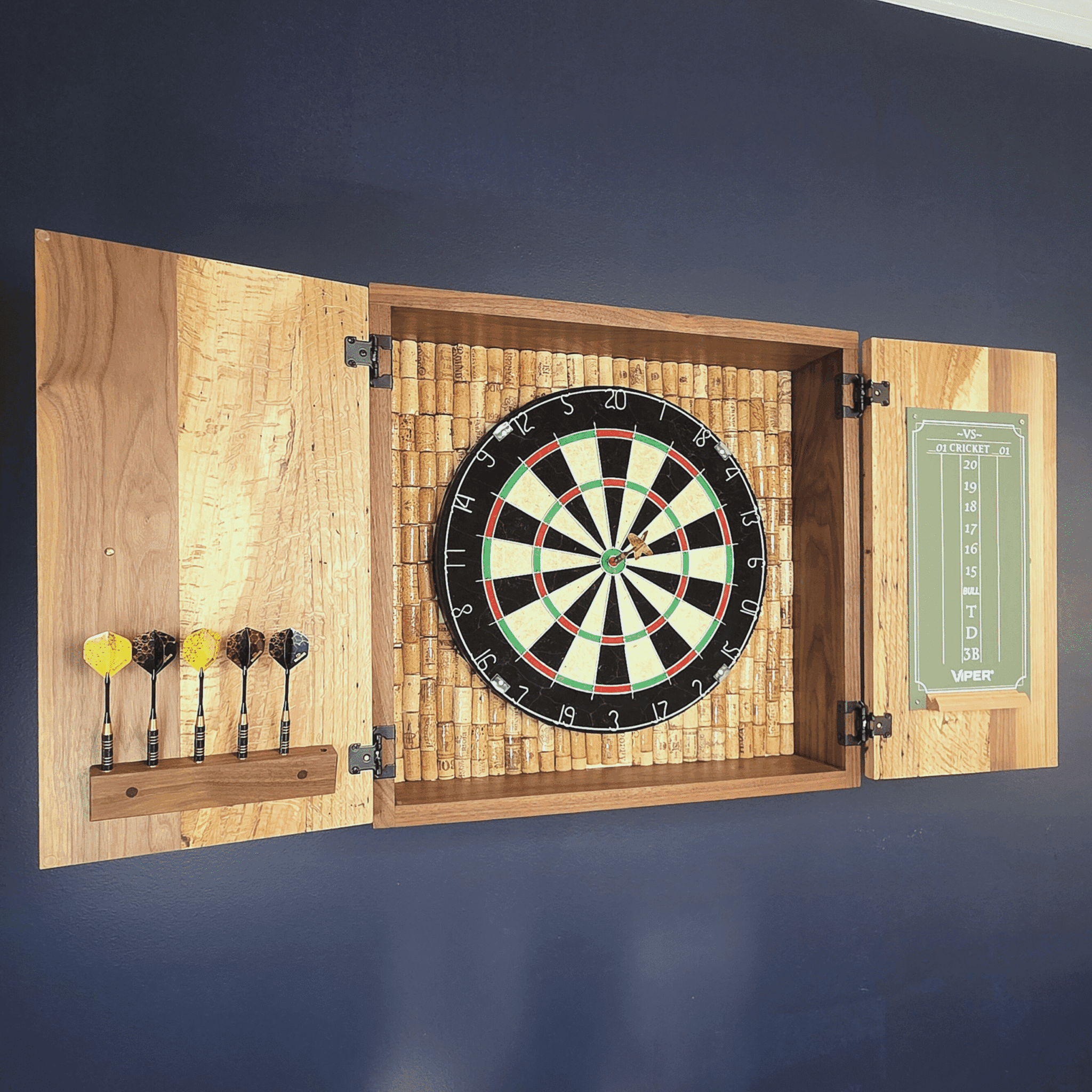 This elegant dartboard cabinet is built from solid walnut and features live edge red oak doors that highlight the natural character of the wood. The cabinet uses precision finger joints for strength and craftsmanship, offering both style and durability. Inside, it includes a dart holder, scoring board, and a complete set of darts. Hand-finished to enhance the natural grain, this piece adds warmth and sophistication to any game room or entertainment space.
