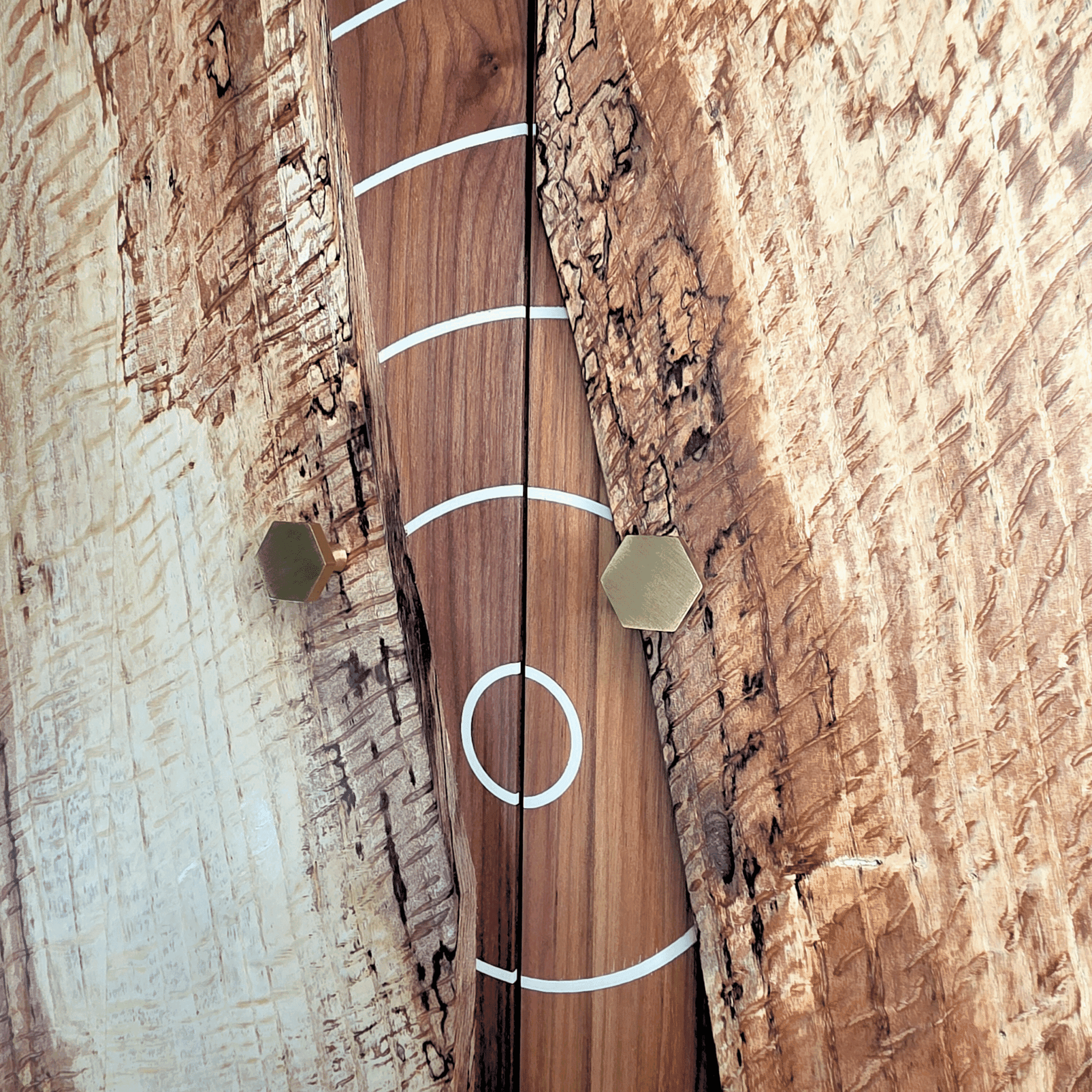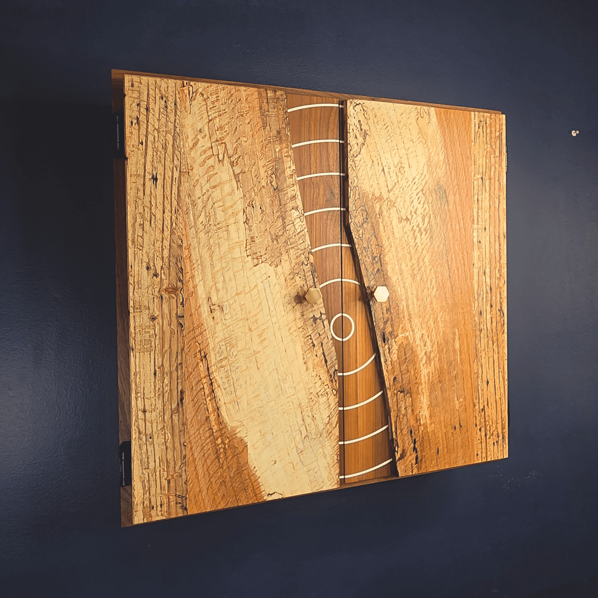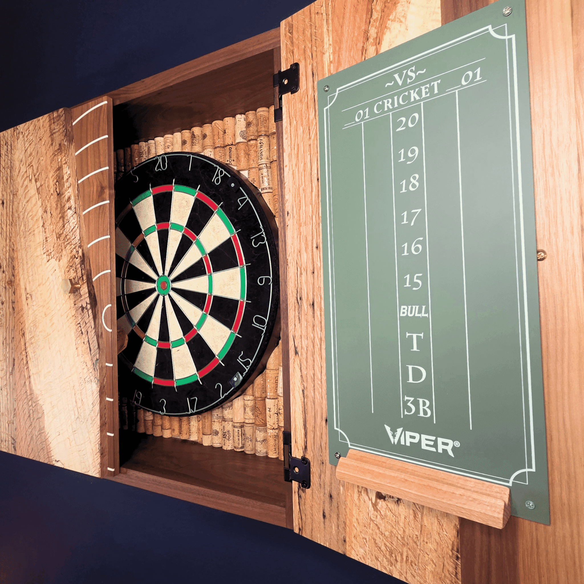 This elegant dartboard cabinet is built from solid walnut and features live edge red oak doors that highlight the natural character of the wood. The cabinet uses precision finger joints for strength and craftsmanship, offering both style and durability. Inside, it includes a dart holder, scoring board, and a complete set of darts. Hand-finished to enhance the natural grain, this piece adds warmth and sophistication to any game room or entertainment space.